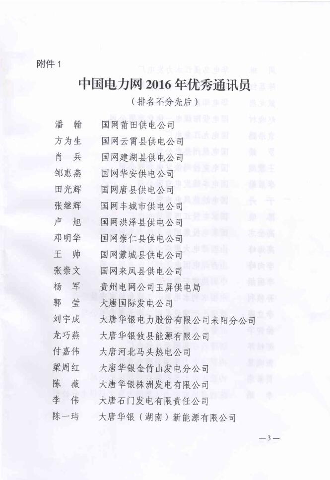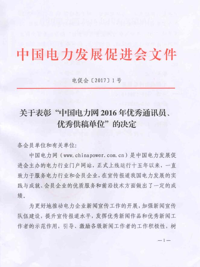關(guān)于表彰“中國(guó)電力網(wǎng)2016年優(yōu)秀通訊員、優(yōu)秀供稿單位”的決定