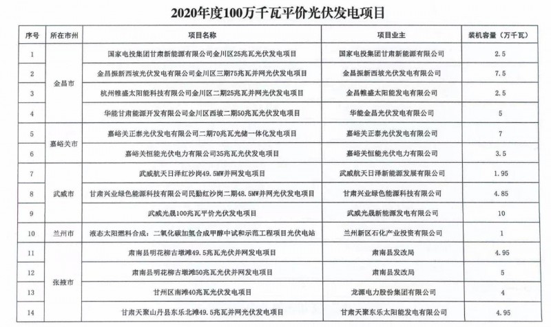 3月25日,甘肅省發改委發布《關于加快推進全省新能源存量項目建設工作》的通知。文件明確,甘肅省目前新能源存量項目約600萬千瓦。其中,光伏發電項目1.23GW包括:酒湖直流工程配套23.5萬千瓦光伏發電項目以及《國家發展改革委辦公廳國家能源局綜合司關于公布2020年風電、光伏發電平價上網項目的通知》(發改辦能源〔2020〕588號)中尚未并網100萬千瓦光伏發電項目。