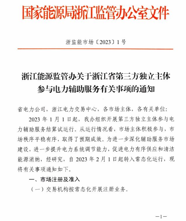 2月1日,國家能源局浙江能源監管辦發布了關于浙江省第三方獨立主體參與電力輔助服務有關事項的通知。