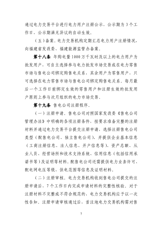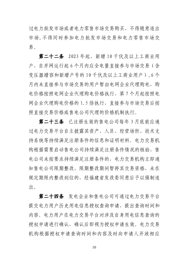(三)獨立新型儲能主體參與電能量市場應滿足最大充 放電功率、最大調節容量及持續充放電時間的準入條件,充 電/放電功率不小于 1 萬千瓦,且持續時間不小于 1 個小時。 第八條 直接參與市場交易用戶(除居民、農業用電電量 外)原則上應全電量入市。已直接參與市場交易的高耗能用 戶,不得退出市場交易。