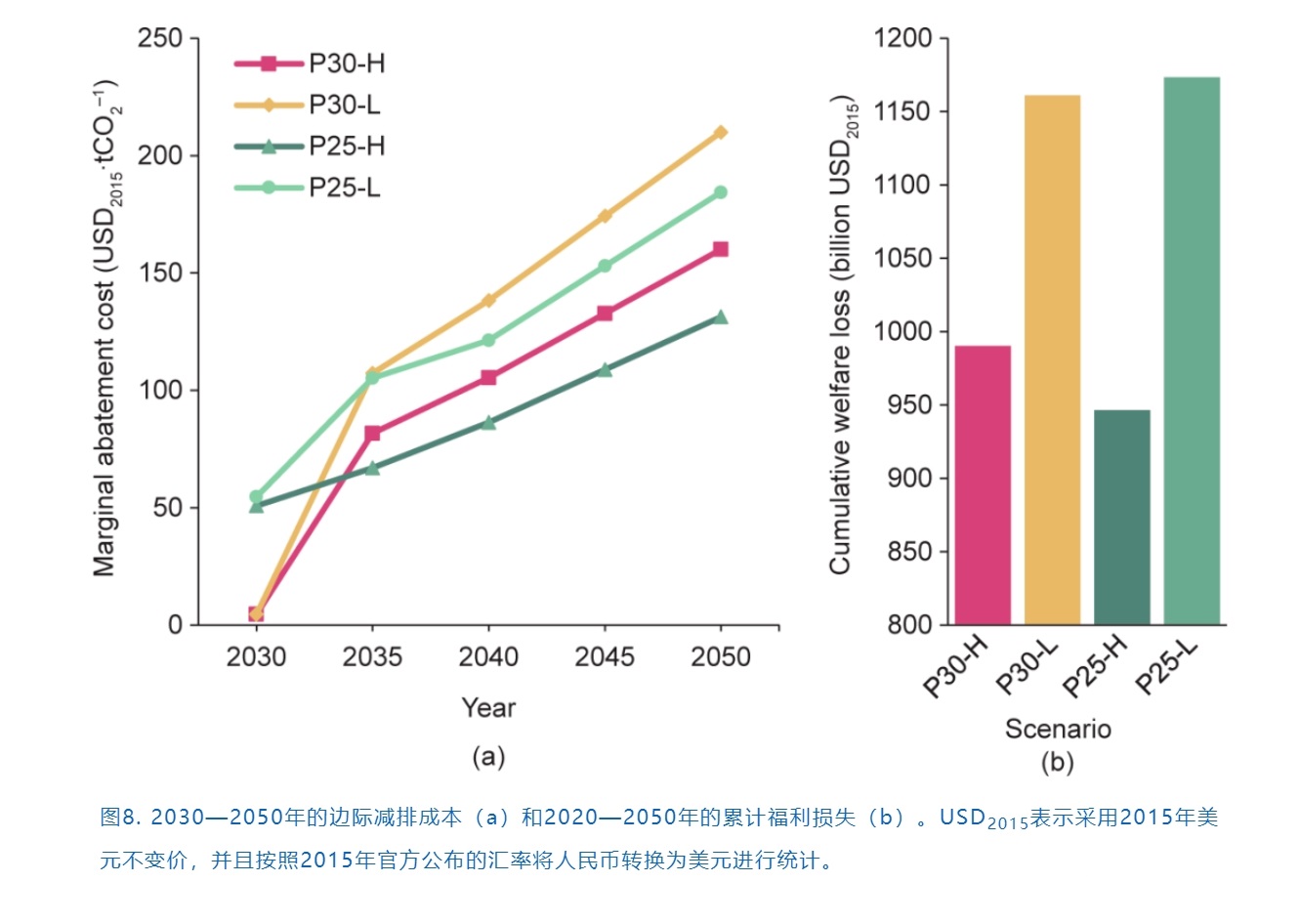 福利損失是另一個用于衡量轉(zhuǎn)型成本的指標(biāo)。MAC關(guān)注的是減排的難度,而福利損失衡量了減排對于消費(fèi)者和生產(chǎn)者產(chǎn)生的影響。圖8(b)顯示,相較于僅實(shí)現(xiàn)國家自主貢獻(xiàn)目標(biāo)的基準(zhǔn)情景,在2020—2050年,碳中和情景的累計福利損失為0.947~1.173萬億美元。2050年碳預(yù)算較低的情景(P25-L和P30-L)的福利損失將比另外兩個情景高17%~24%,而達(dá)峰時間對于福利損失和能源服務(wù)需求的變化影響較小。