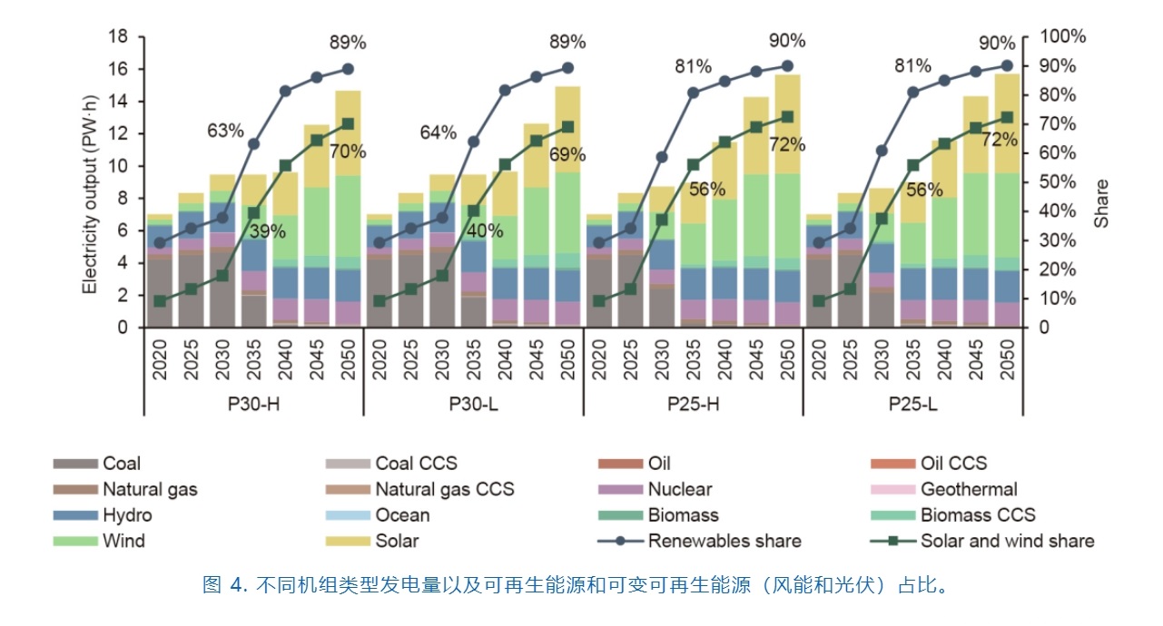 發(fā)電結(jié)構(gòu)的變化主要是因?yàn)槊弘姀S的退役和風(fēng)能及光伏發(fā)電的增加。可以預(yù)計,煤電廠將很快進(jìn)入轉(zhuǎn)型最關(guān)鍵的10年。在此期間,煤電廠要么需要提前退役,要么將進(jìn)行靈活性改造以進(jìn)入輔助服務(wù)市場,或者轉(zhuǎn)變?yōu)樯镔|(zhì)-煤混燃電廠甚至純BECCS電廠,從而能夠產(chǎn)生負(fù)排放。研究表明,碳達(dá)峰的時間在很大程度上取決于燃煤電廠退出發(fā)電序列的速度。比較P25和P30情景,發(fā)現(xiàn)近期需要盡快停止新建煤電廠并在合理范圍內(nèi)讓落后煤電廠有序退役。到燃煤電廠基本退出后,可再生能源發(fā)電量將占總發(fā)電量的81%,而以風(fēng)能和光伏為代表的可變可再生能源的比例將達(dá)到56%。對于P25情景,風(fēng)能和光伏的總裝機(jī)容量在2035年將達(dá)到3.1 TW,而對于P30情景,風(fēng)能和光伏在2040年的總裝機(jī)容量為3.4 TW。核能將成為電力系統(tǒng)的重要組成部分,未來可再生能源的滲透率會很高,其裝機(jī)容量將在未來20年增長3倍以上。
