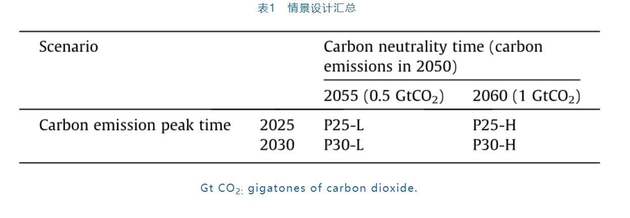 中國最新的長期氣候目標(biāo)是2030年前實(shí)現(xiàn)二氧化碳排放達(dá)峰,到2060年實(shí)現(xiàn)碳中和。為了探討碳達(dá)峰時間和碳中和時間差異對能源系統(tǒng)轉(zhuǎn)型的影響,本文設(shè)計了以下4個轉(zhuǎn)型情景(表1)。