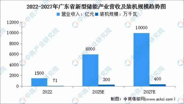儲能是新型電力系統的重要組成部分,在“雙碳”目標下,廣東省新型儲能產業具有良好發展前景。數據顯示,2022年廣東省新型儲能產業營業收入約1500億元,裝機規模達到71萬千瓦。預計到2025年,廣東省新型儲能產業營業收入達到6000億元,年均增長50%以上,裝機規模達到300萬千瓦;到2027年,廣東省新型儲能產業營業收入達到1萬億元,裝機規模達到400萬千瓦。