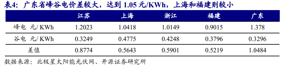 目前儲(chǔ)能站盈利模式的其中一類(lèi)是采取峰谷電價(jià)套利模式,即儲(chǔ)能站在谷時(shí)充 電,峰時(shí)放電,以此補(bǔ)平電網(wǎng)負(fù)荷曲線(xiàn)的同時(shí)獲取峰谷電價(jià)差值的收益。 參考 2023 年各省電網(wǎng)企業(yè)代理購(gòu)電價(jià)格來(lái)看,江蘇、上海、浙江、福建、廣東 等省為代表性較強(qiáng)的省份,選取谷時(shí)和高峰時(shí)段電價(jià)進(jìn)行比較,上海和福建的峰谷 電價(jià)差值較小,僅為 0.56 元、0.52 元/KWh,而廣東則價(jià)差較大,達(dá)到 1.05 元/KWh。