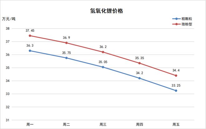 上周,3月27日-3月31日,鋰價繼續下跌。其中,電池級碳酸鋰價格下探至23.8萬元/噸,氫氧化鋰價格低至33.25萬元/噸,六氟磷酸鋰低至10.15萬元/噸。