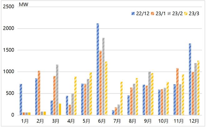 對比前期(22/12、23/1、23/2)數據,發現2023年Q1各月儲能投運延期較為顯著,推測延期原因主要系供應鏈問題和并網排隊等。根據各期數據,上半年仍有投運小高峰,我們分析認為這是因為每年7-8月是美國夏季負荷高峰,是儲能獲取收益的重要月份,因此6月底前是儲能項目投運的重要時間節點。