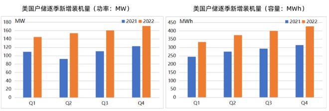 根據Wood Mackenzie數據顯示,2022年美國新增工商儲裝機容量為164MW/354MWh,同比+1%/+1%。其中,2022Q4新增48MW/96MWh,同比-17%/-27%,環比+80%/+71%。