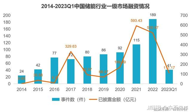 在投融資上,儲能行業(yè)也成為一級市場投資新熱點(diǎn),其熱度持續(xù)高漲,尤其是2022年,儲能融資處于爆發(fā)期。據(jù)睿獸分析統(tǒng)計(jì),2022年,我國儲能行業(yè)融資事件189件,同比增長64.3%,融資金額520.97億元,也處于高位。