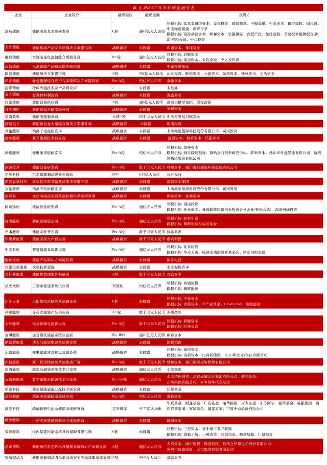 7月5日,海辰儲能完成45億元C輪融資;4月17日,融科儲能完成超10億元B+輪融資;3月20日,星源博瑞A輪融資數(shù)億源、大鋅能源完成pre-A輪融資數(shù)千萬元、華錦新能源完成天使輪融資數(shù)千萬元;3月28日,精控能源完成C輪數(shù)億元融資;3月18日,緯景儲能完成超6億元A輪融資等等。其中儲能戰(zhàn)略融資事件最多達23起,其次是A輪融資共18起。