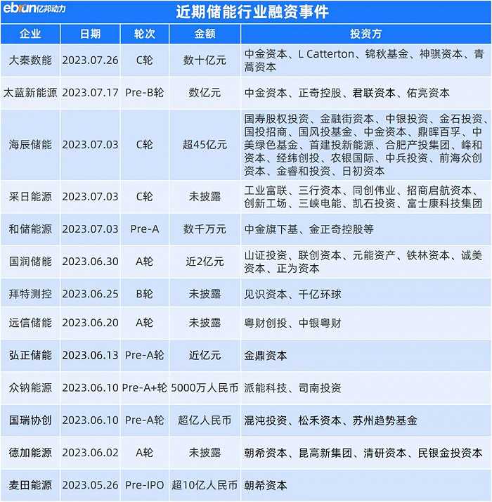 7月5日,海辰儲能完成C輪融資,由國壽股權和金融街資本共同領投,金額超45億元,是已知目前儲能行業2023年金額最大的一筆融資。海辰儲能是一家從事鋰電池核心材料、磷酸鐵鋰儲能電池及系統的研發、生產和銷售業務的企業。7月3日證監會發布公告顯示,海辰儲能上市輔導備案已獲受理,正式進入IPO上市流程。