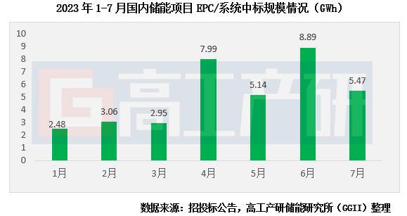 智通財經獲悉,依據GGII發布的《高工儲能行業數據庫》不完全統計,2023年7月國內共有19個儲能項目EPC/系統公布中標結果,規模合計2.44GW/5.47GWh,中標數量和裝機容量分別較上月下降30%和38%。