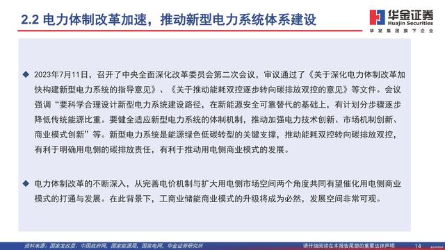 2023年7月11日,召開了中央全面深化改革委員會第二次會議,審議通過了《關(guān)于深化電力體制改革加快構(gòu)建新型電力系統(tǒng)的指導(dǎo)意見》、《關(guān)于推動能耗雙控逐步轉(zhuǎn)向碳排放雙控的意見》等文件。會議強(qiáng)調(diào)“要科學(xué)合理設(shè)計(jì)新型電力系統(tǒng)建設(shè)路徑,在新能源安全可靠替代的基礎(chǔ)上,有計(jì)劃分步驟逐步降低傳統(tǒng)能源比重。要健全適應(yīng)新型電力系統(tǒng)的體制機(jī)制,推動加強(qiáng)電力技術(shù)創(chuàng)新、市場機(jī)制創(chuàng)新、商業(yè)模式創(chuàng)新”等。新型電力系統(tǒng)是能源綠色低碳轉(zhuǎn)型的關(guān)鍵支撐,推動能耗雙控轉(zhuǎn)向碳排放雙控,有利于明確用電側(cè)的碳排放責(zé)任,有利于推動用電側(cè)商業(yè)模式的發(fā)展。