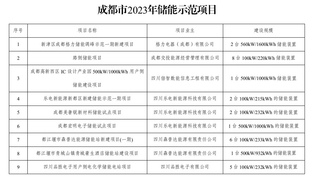 為加快推動成都市儲能產業發展,著力構建清潔低碳安全高效的現代能源體系,前期成都市發改委印發了《關于申報2023年污染治理和節能減碳領域(儲能專項)市預算內投資項目的通知》(成發改環資函〔2023〕92號),對年利用小時數不低于600小時的儲能示范設施給予每千瓦230元/年補助,補貼周期為連續3年,每年最高不超過100萬。經企業自愿申報和專家評審,共有9個儲能項目被納入成都市2023年儲能示范項目,現予以公示。