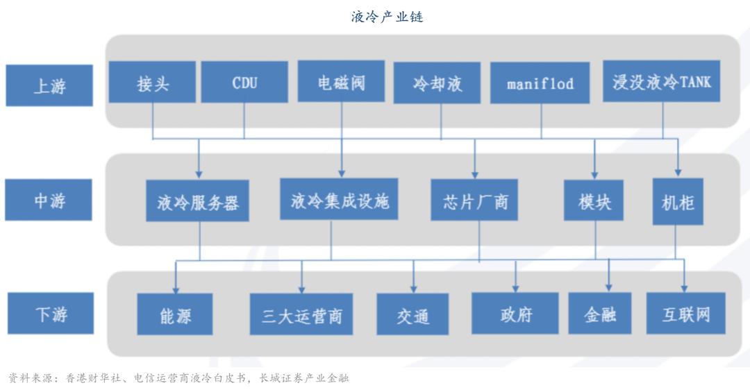 相比于風冷技術,液冷具有更高的冷卻效率和成長性。根據中國證券報研究,產品零部件提供商、液冷服務器提供商及算力使用者貫穿整個液冷產業生態的上、中、下游。我國液冷技術起步稍晚于國外,但起步后發展迅速,后期與國外發展進程基本同步,并且在液冷規模試點應用方面積累了豐富經驗。