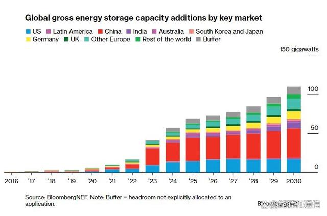 BloombergNEF對全球主要地區到2030年底的安裝量預測。