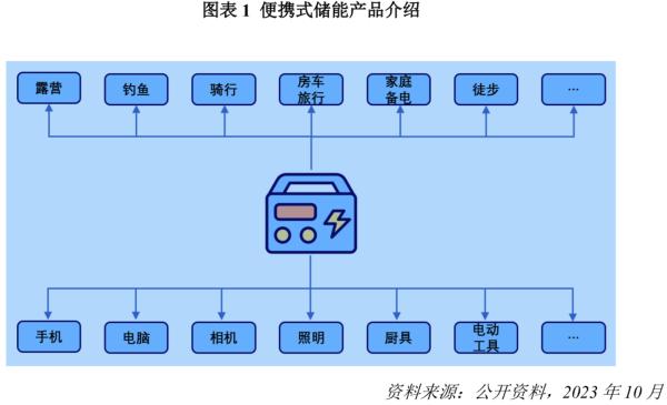 在戶外露營活動中,便攜式儲能可以給手機、電腦等個人數碼產品充電,還可以給電 磁爐、冰箱、照明燈具、投影儀等較大功率的電器提供短時供電,滿足消費者戶外運動、 戶外露營全部的用電需求。