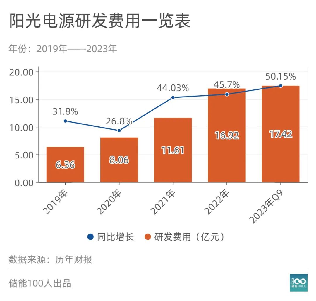 事實上,陽光電源自1997年成立起,26年來一直不斷加大科研投入,時刻不忘技術創新。截至目前,其在合肥、上海、南京、深圳、德國、荷蘭有六大研發中心,研發人員占比40%,2023年前三季度研發費用投入17.42億元。申請專利5300余項,持有數業內第一。