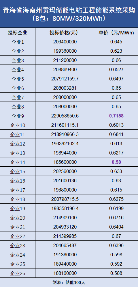 B包:容量為80MW/320MWh,共吸引了26家企業投標,最低報價為0.58元/Wh,最高報價為0.7158元/Wh。(投標報價詳情見下圖)