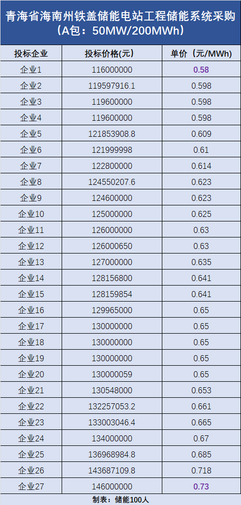 A包:容量為50MW/200MWh,共吸引了27家企業投標,最低報價為0.58元/Wh,最高報價為0.73元/Wh。(投標報價詳情見下圖)