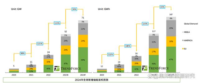 展望2024年,TrendForce集邦咨詢預(yù)計,24年全球儲能新增裝機(jī)有望達(dá)71GW/167GWh,同比增長36%/43%,保持高增。