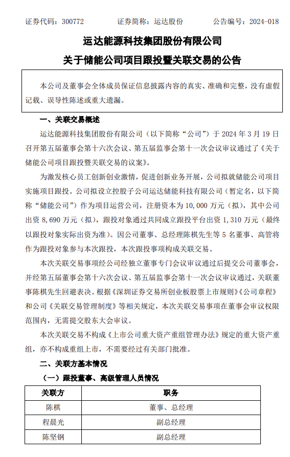 3月19日,運達股份發布《關于儲能公司項目跟投暨關聯交易的公告》。