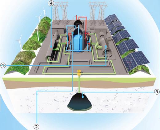 作為新型儲能技術的一種,壓縮空氣儲能指在電網負荷低谷期利用電能將空氣高壓密封在報廢礦井、過期油氣井等地點,并在電網負荷高峰期釋放高壓空氣推動汽輪機發電的儲能方式。以中儲國能(北京)技術有限公司投資建設的肥城300兆瓦鹽穴壓縮空氣儲能國家示范項目為例,在用電低谷時,儲能系統利用電能驅動電動機帶動壓縮機,將空氣壓縮并儲存在地下鹽穴中,這個過程中產生的壓縮熱被儲存在球罐中;在用電高峰時,則釋放鹽穴內的高壓空氣,經儲存的壓縮熱預熱升溫后,驅動膨脹機帶動發電機進行發電,再把電力送到電網,配合電網進行調峰。