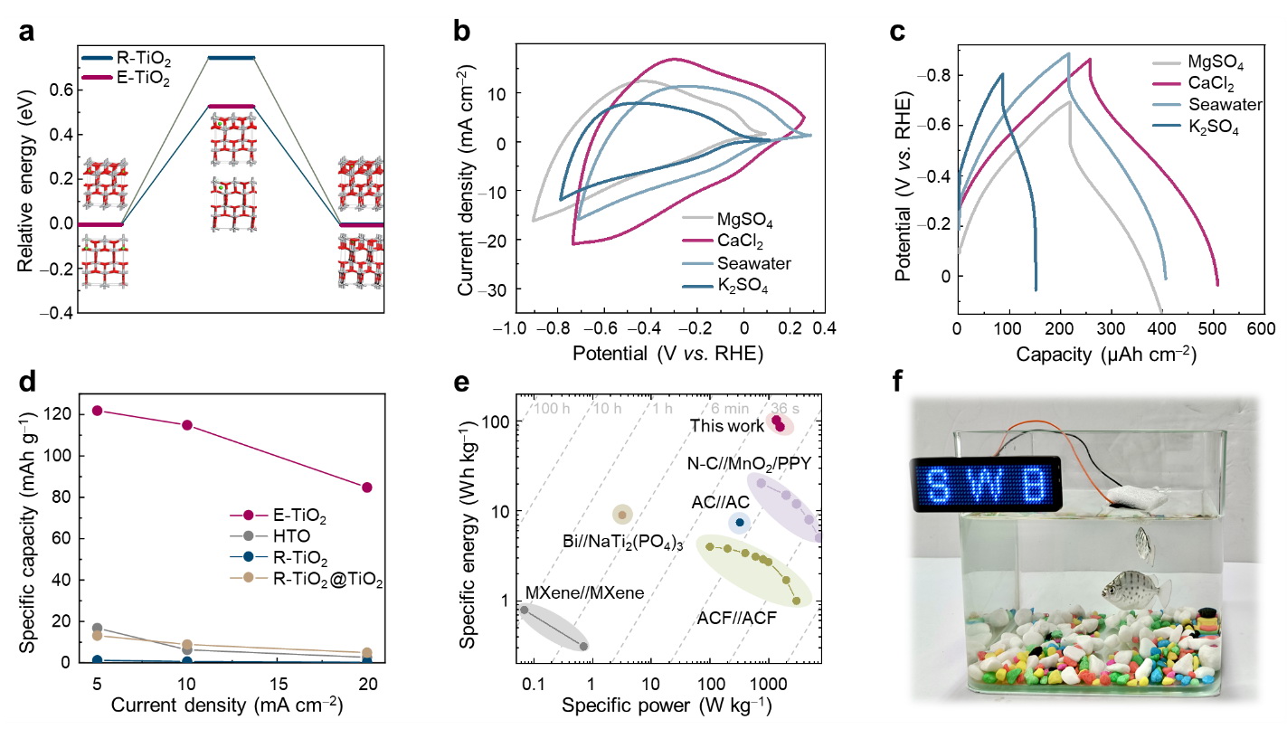 要點5:圖5a的DFT計算表明,E-TiO2同樣可以降低其他陽離子的擴散勢壘(例如Ca2+)。通過CV和GCD(圖5b,c)可知,E-TiO2在其他電解液中也具有類似于儲鈉時的贗電容主導特性。當電流密度為10mA/cm2時,E-TiO2儲存Ca2+和Mg2+的面容量分別為247和182 μAh/cm2,接近Na+的容量(259 μAh/cm2)。直接使用天然海水作為電解液,構建了以E-TiO2為負極材料,電催化劑為正極的海水二次電池。在5 mA/cm2的電流密度下,E-TiO2的比容量為152 mAh/g(圖5d)。基于正負極活性物質的質量,新型海水電池的比能量/功率密度優于當前報道的可充放海水儲能器件、水系鈉鉀及鎂鈣離子電池(圖5e)。團隊對二次海水電池的原型也進行了展示(圖5f)。