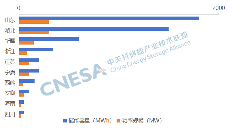 從區域分布上看,新型儲能投運項目主要分布在山東、湖北、新疆、浙江、江蘇等15個省市自治區,其中湖北、山東、新疆、江蘇、寧夏新增投運規模在百兆瓦級。湖北、山東各有一個300MW級壓縮空氣儲能項目首次并網發電一次成功,分別位居功率規模和能量規模首位。