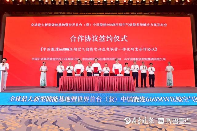 會上,中國能建數科集團發布《世界首臺(套)中國能建660MW壓縮空氣儲能系統解決方案》,并介紹了中國能建在山東省建設3060MW儲能基地的規劃布局及賦能“西電東送”新圖景。山東國惠投資控股集團有限公司、中國石油集團渤海鉆探工程有限公司、陜西鼓風機(集團)有限公司、上海電氣電站集團等項目合作企業,與中國能建數科集團共同簽訂了《中國能建660MW壓縮空氣儲能系統核心裝備技術方案研發合作協議》等三項合作協議,標志著圍繞壓縮空氣儲能的又一“政企合作、央地共建”典范項目正式吹響集結號。