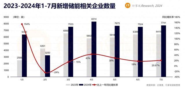 儲能設(shè)備相關(guān)企業(yè)中,4月新增量最多,達7174家,比去年同期增47.55%;5月、6月、7月新增量有所下滑,維持在6400-6600之間。與2023年同期相比,1月新增幅度最大,增速超1.5倍多。