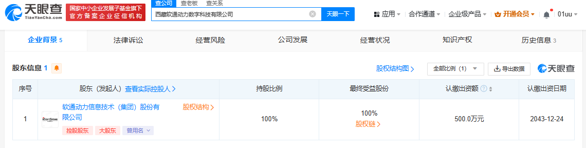 近日,西藏軟通動(dòng)力數(shù)字科技有限公司成立,法定代表人為于麗群,注冊(cè)資本500萬人民幣,經(jīng)營范圍包括數(shù)字文化創(chuàng)意軟件開發(fā)、數(shù)字內(nèi)容制作服務(wù)、物聯(lián)網(wǎng)應(yīng)用服務(wù)、互聯(lián)網(wǎng)數(shù)據(jù)服務(wù)等。股東信息顯示,該公司由軟通動(dòng)力(301236)全資持股。