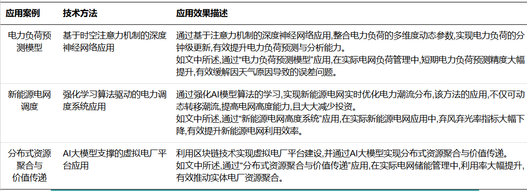 傳統的電力系統供需匹配存在發電慣性大、儲能能力不足、調峰能力有限、跨區域調配壁壘等問題,在大模型技術支撐下電力系統供需匹配的復雜性得到系統性突破。基于時空注意力機制(指在時間和空間維度上對輸入數據進行自適應處理的方法)的深度神經網絡,整合用戶側用電數據、分布式能源+儲能、電力市場交易信息等多維度動態參數,構建起分鐘級更新的負荷預測模型。筆者根據《國家電網報》的數據統計得出:2024年,在華東某省級電網的實測中,基于智能電網的AI大模型預測電網負荷,全網平均負荷預測準確率達98.49%,日最高負荷預測準確率達99.08%,數據收集工作時長從30 min縮短至2 min,有效緩解傳統預測方法因天氣突變導致的誤差放大問題;針對高比例新能源接入的電網,強化學習算法驅動的調度系統實時優化電力潮流分布,在西北某新能源基地的應用案例中,棄風棄光率(指在一定時間內,因各種原因導致的風電和光伏發電未能被充分利用的比例)從12.6%降至3.8%,分布式潮流控制裝置總容量為5.8萬kVA,可動態轉移潮流10萬kW;大模型支撐的虛擬電廠平臺聚合海量分布式資源,通過區塊鏈技術實現價值傳遞,在國家電網廣東省試點項目中,用戶側儲能系統的利用率提升60%,需求響應參與度達到83%,通過智能化的供需協同機制與AI大模型的深度應用(如表2所示),推動電力系統向“源網荷儲”深度互動的新型模式演進[3]。同時,為避免單一數據源出現信息失真,國家電網通過AI大模型對溫度、濕度、風速等主要參數進行三重校驗與交叉驗證,有效避免數據誤差造成預測失真的問題。