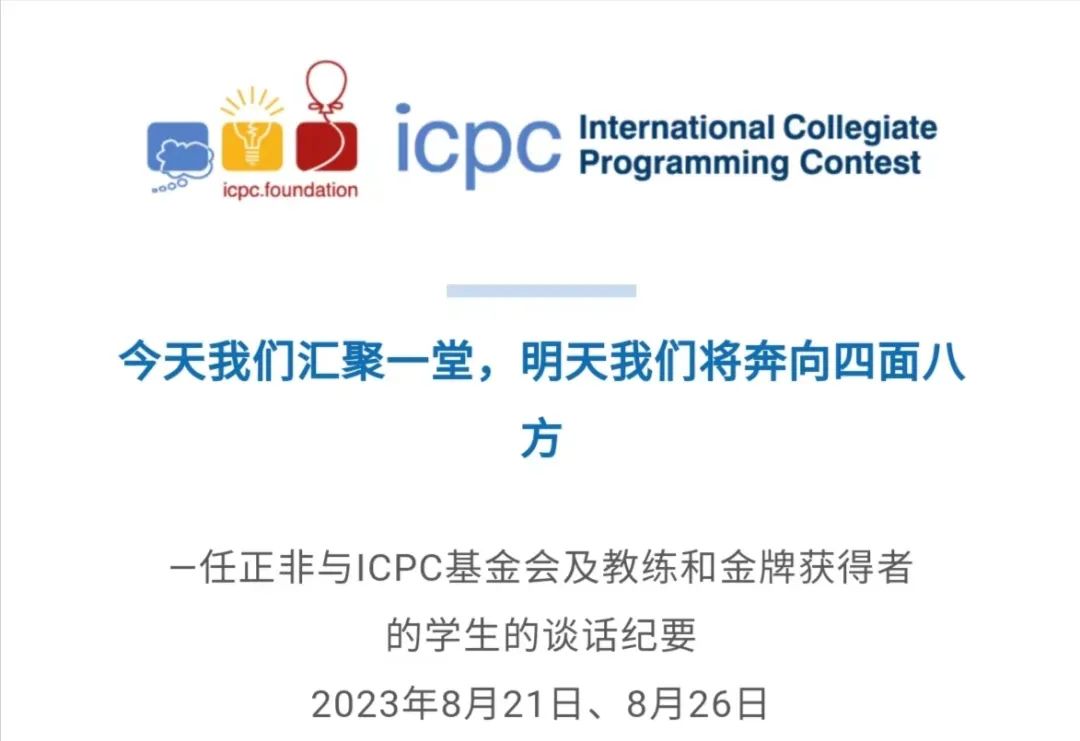 9月19日,國際大學生程序設計競賽(International Collegiate Programming Contest,簡稱ICPC)官網披露了華為創始人兼CEO任正非8月21日、8月26日與ICPC基金會及教練和金牌獲得者的學生的談話紀要。