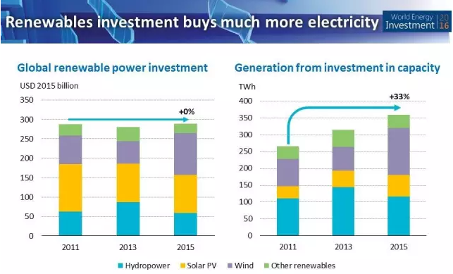 2015年電力行業投資達到了創紀錄的6900億美元,超過能源總投資的37%。可再生能源投資占17%,約占了電力投資的一半。可再生能源投資中,16%來自發電,生物和太陽能只占1%。