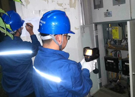 中國電力網(wǎng)訊 6月22日晚,在濰坊壽光市張建橋社區(qū),國網(wǎng)壽光市供電公司城區(qū)供電中心工作人員對高低壓線路設(shè)備進行夜巡,用紅外測溫設(shè)備對電纜頭、隔離開關(guān)等關(guān)鍵部位進行測溫,及時發(fā)現(xiàn)并消除設(shè)備運行缺陷,保障轄區(qū)居民夏季安全可靠用電。