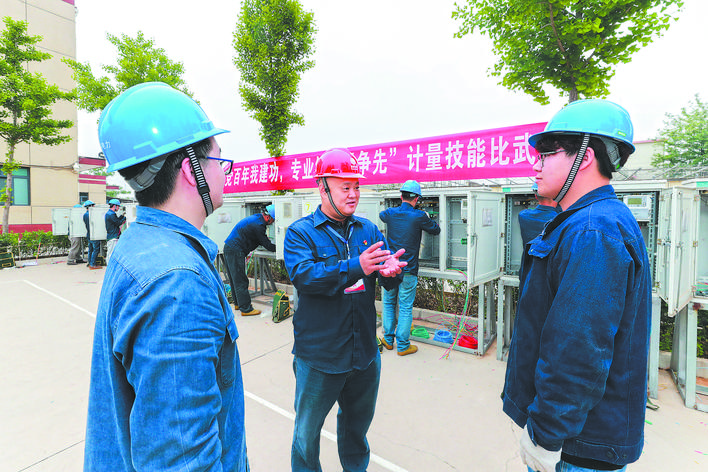 張遠平(左)在計量專業技能比武活動現場,向選手講解裝表接電技術要點。黃曉東 攝