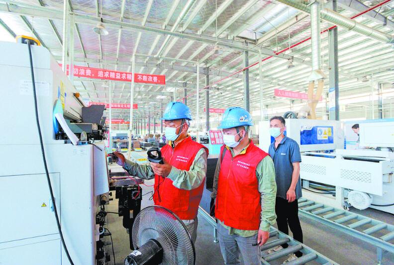 國家電網湖北電力(孝感)共產黨員服務隊隊員來到應城市一家企業的生產車間,幫助企業檢查用電設備。