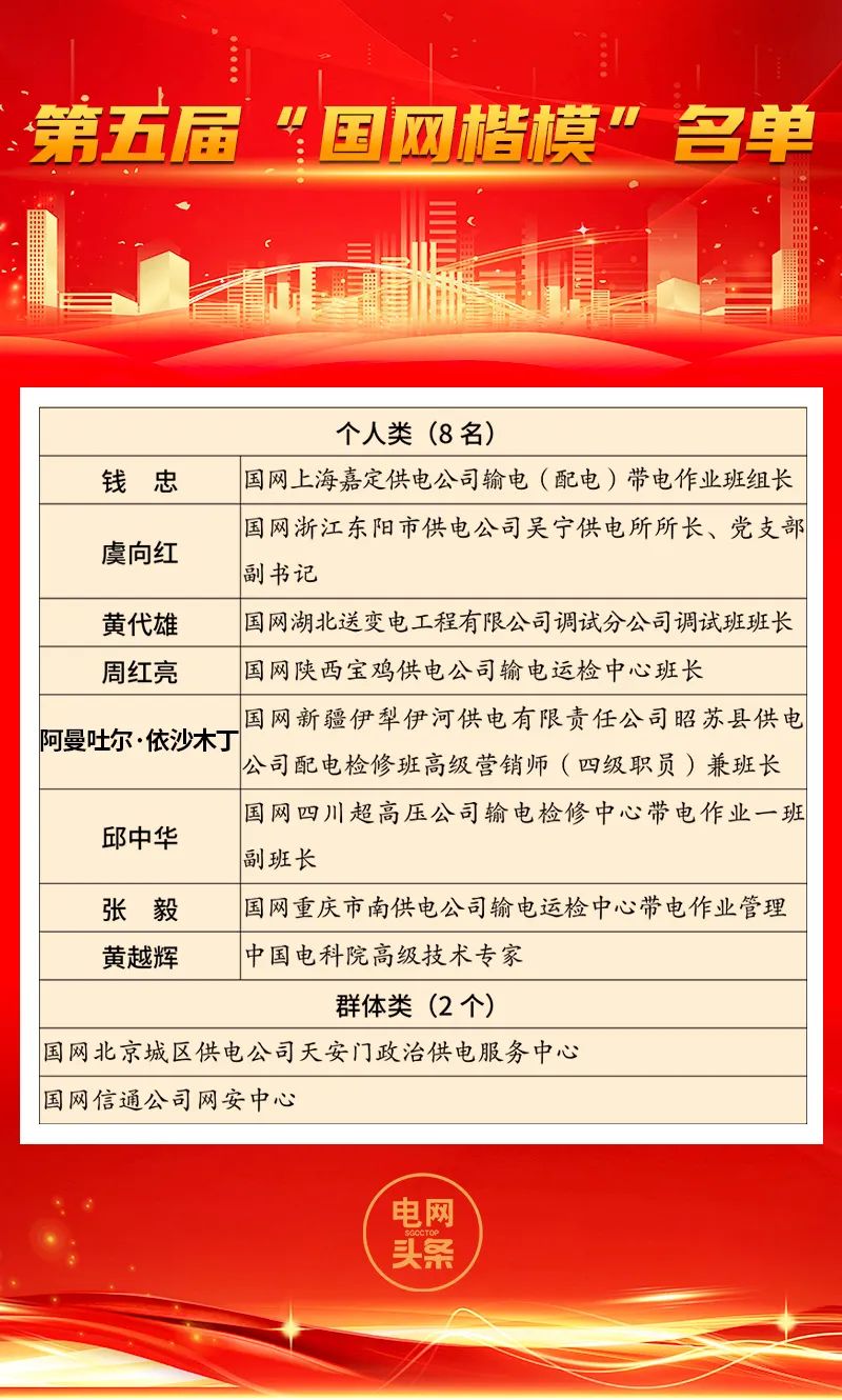 為深入學習貫徹習近平總書記關于黨的建設的重要思想和習近平文化思想,認真落實學習貫徹習近平新時代中國特色社會主義思想主題教育關于“學習身邊榜樣”活動要求,充分發揮先進典型示范引領作用,大力弘揚電力精神和電網鐵軍精神,凝聚推動公司“一體四翼”高質量發展的強大合力,根據公司黨組統一部署,按照年度表彰計劃,公司組織開展了第五屆“國網楷模”評選活動,與第四屆“國網楷模”以及“最美國網人”一并發布。在各單位培育選樹、逐級推薦的基礎上,經資格審查、聯評投票、專家評審及公示等環節,公司黨組研究決定,授予宰紅斌等8名同志和國網天津電力“大山里行走的紅馬甲”青年志愿服務隊等2個群體第四屆“國網楷模”榮譽稱號,授予錢忠等8名同志和國網北京城區供電公司天安門政治供電服務中心等2個群體第五屆“國網楷模”榮譽稱號,授予曾兵等86名同志“最美國網人”榮譽稱號。