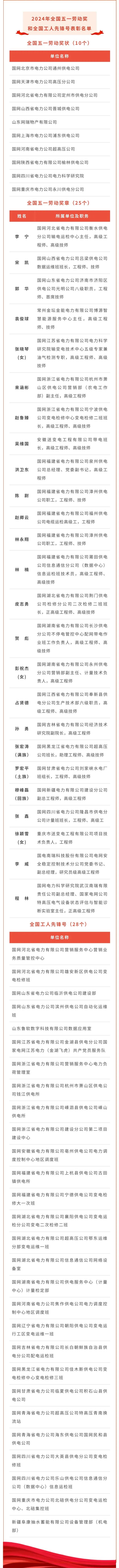 4月28日,2024年慶祝“五一”國際勞動節(jié)暨全國五一勞動獎和全國工人先鋒號表彰大會在北京人民大會堂舉行。255個集體和1088名個人分獲全國五一勞動獎狀、全國五一勞動獎?wù)拢?034個集體獲全國工人先鋒號。國家電網(wǎng)有限公司系統(tǒng)10家單位獲全國五一勞動獎狀,25名個人獲全國五一勞動獎?wù)拢?8個集體獲全國工人先鋒號。