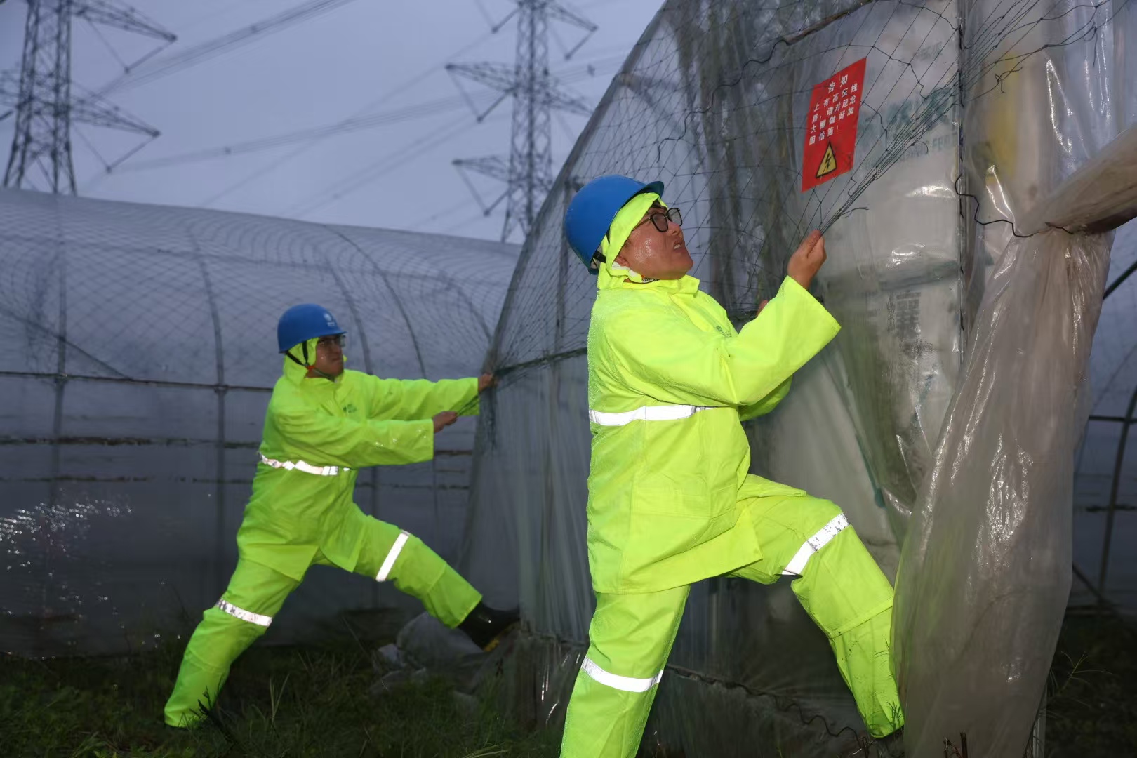 國網上海超高壓公司輸電運維人員在浦東臨港地區緊急處置輸電通道下破損蔬菜大棚