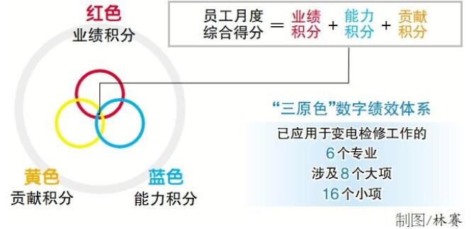 杭州供電公司為適應企業(yè)轉型升級要求,樹立“工資靠掙、業(yè)績靠干”績效理念,于今年2月8日起在變電檢修中心221名員工績效考核工作中試點應用“三原色”數字績效體系。紅、藍、黃三原色分別代表衡量工作量的業(yè)績積分、衡量工作能力的能力積分和衡量貢獻大小的貢獻積分。其中,業(yè)績積分又分為安全積分和工單積分。每名員工每個月的綜合得分都由該中心的績效管理員基于業(yè)績、能力、貢獻三個維度計算得出,以實現薪酬多勞多得、能者多得。