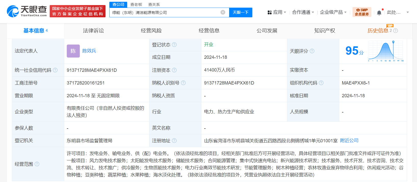 天眼查App顯示,近日,綠能(東明)清潔能源有限公司成立,法定代表人為陳效兵,注冊(cè)資本4.14億元,經(jīng)營(yíng)范圍含發(fā)電業(yè)務(wù)、輸電業(yè)務(wù)、供(配)電業(yè)務(wù),風(fēng)力發(fā)電技術(shù)服務(wù),太陽(yáng)能發(fā)電技術(shù)服務(wù),儲(chǔ)能技術(shù)服務(wù),集中式快速充電站,新興能源技術(shù)研發(fā)等。