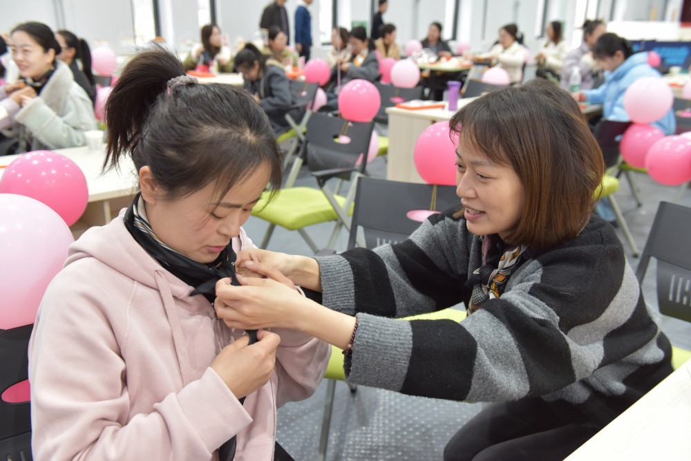 當天的培訓分職場禮儀賦能、清雅妝造課堂、服裝搭配指南三個部分。幾位老師通過專業的視角,針對女職工的需求,現場示范指導,向她們傳授實用的美麗“秘籍”。女職工們紛紛拿出化妝品和絲巾跟隨老師實操實練,現場氣氛輕松愉悅,笑聲不斷。