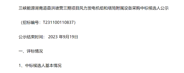 公告顯示,第一中標候選人:浙江運達風(fēng)電股份有限公司,投標報價:130,815,000.00元。