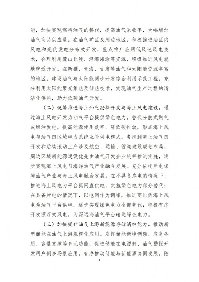 文件指出,要統籌推進陸上油氣勘探開發與風光發電。充分利用陸上油氣田風能和太陽能資源稟賦較好、建設條件優越、具備持續規模化開發條件的優勢,著力提升新能源就地消納能力。重點推進大慶、長慶、勝利、塔里木、新疆、華北等油田風電和光伏發電集中式開發。在油氣礦區及周邊地區,積極推進油區內風電和光伏發電分布式開發,在新疆、青海、甘肅等油氣和太陽能資源豐富的地區,建設油氣與太陽能同步開發綜合利用示范工程,充分利用太陽能聚光集熱及儲熱技術,實現油氣生產過程的清潔化供熱,助力低碳油氣開發。