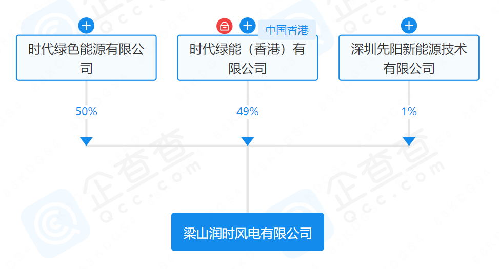 從企查查獲悉,近日,梁山潤時風電有限公司成立,注冊資本1000萬元人民幣。新公司由深圳先陽新能源技術有限公司(1%)、時代綠能(香港)有限公司(49%)以及寧德時代旗下時代綠色能源有限公司(50%)共同持股。