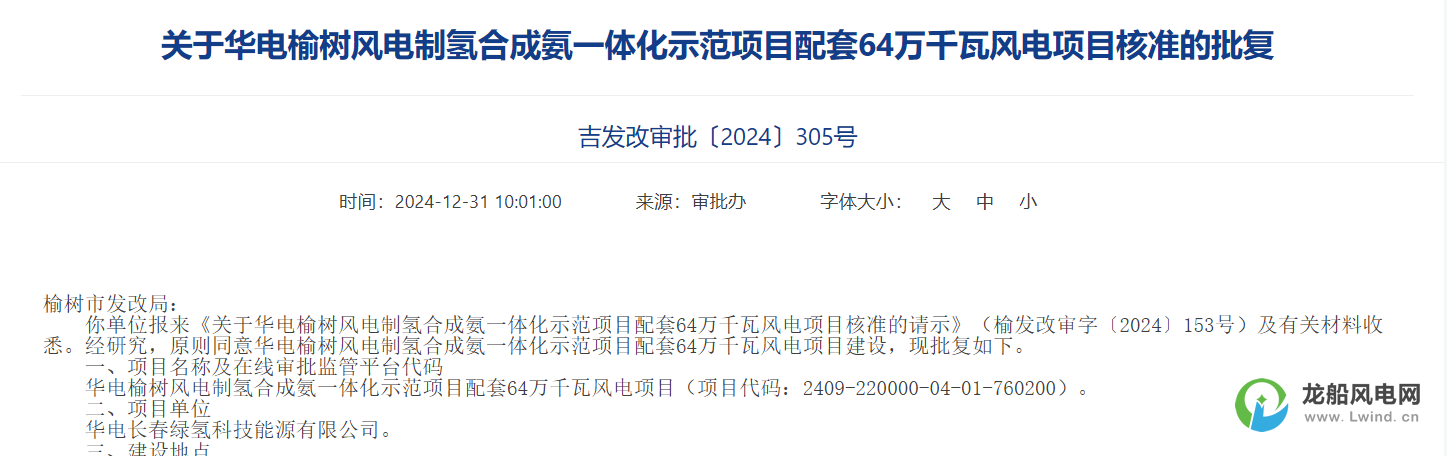 華電榆樹風電制氫合成氨一體化示范項目配套64萬千瓦風電項目建設地點位于榆樹市五棵樹鎮、弓棚鎮、劉家鎮、恩育鄉、閔家鎮、先鋒鄉。 項目新建單機容量10兆瓦風電機組64臺,總裝機容量為640兆瓦,發電方式為自發自用不上網;配套建設箱變、集電線路、道路等附屬設施。 項目總投資287813.55萬元,建設期限12個月,項目單位為華電長春綠氫科技能源有限公司。