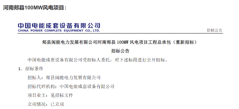 公告顯示,郟縣 100MW風電項目位于河南省平頂山市郟縣,規劃裝機容量為 100MW,擬安裝20臺5.0MW風電機組,新建 220kV 升壓站一座,并配置41.4MW/82.56MWh磷酸鐵鋰電池儲能。