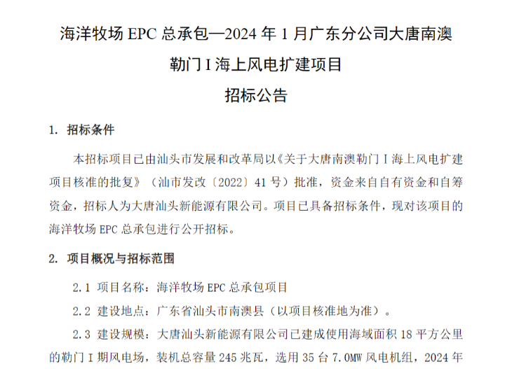 招標范圍:本次招標為大唐南澳勒門 I 海上風電擴建項目海洋牧場 EPC總承包工程,包括但不限于勘察設計、采購、運輸、施工、調試、驗收、質量保證服務(含 CCS 檢測認證、三同時)等全部工作及招標技術文件規定的其它工作,具體工作范圍詳見技術規范書。